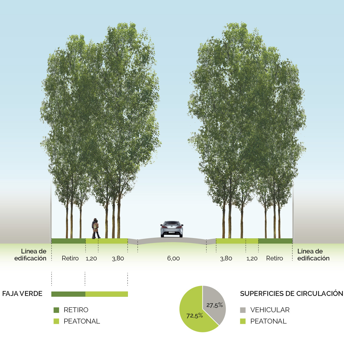 Las márgenes verdes de las calles promueven el uso peatonal ya que por sus dimensiones dan mejores condiciones de seguridad al circular. A la vez, se suman a las ya existentes áreas verdes aptas para recreación